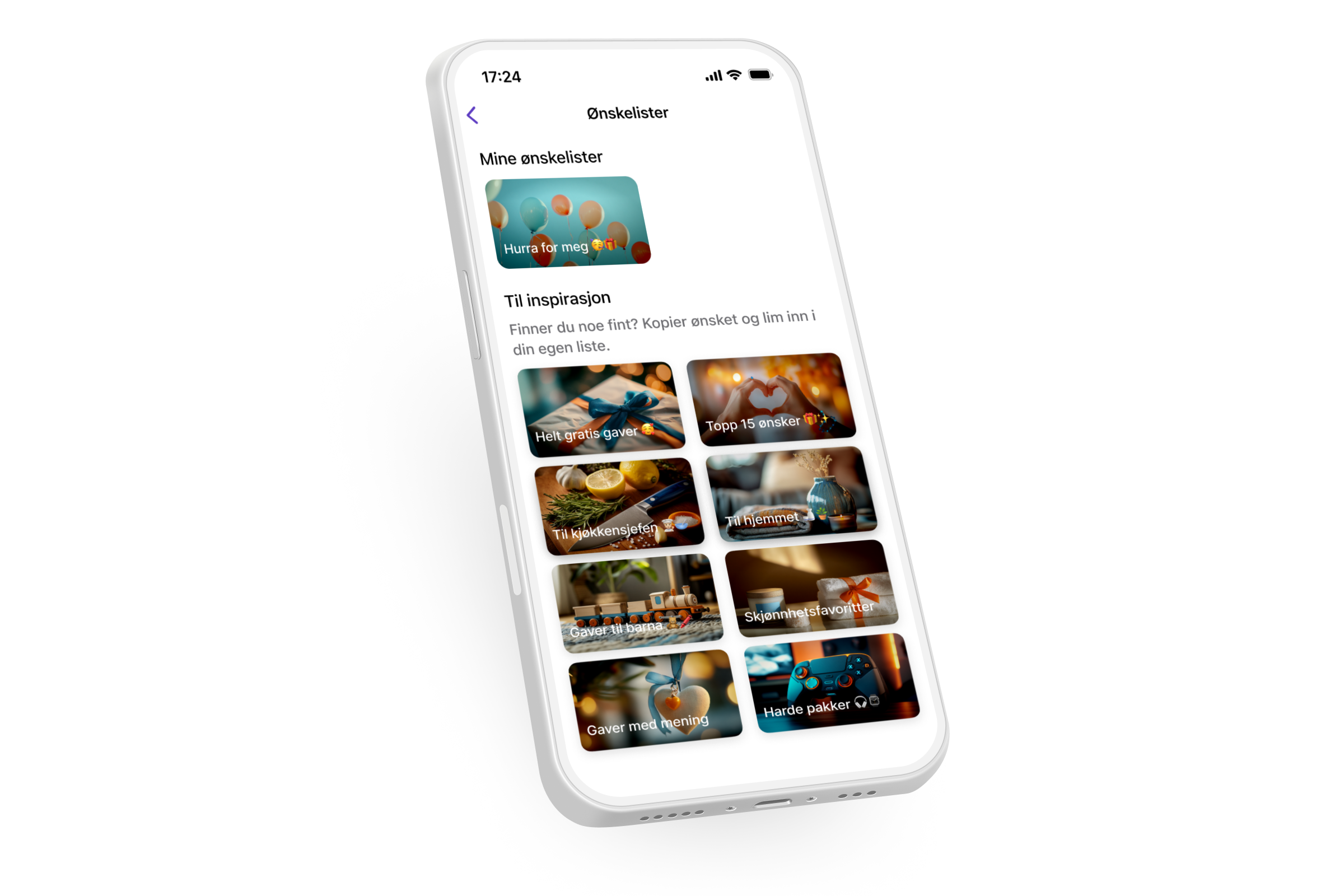 Få inspirasjon i Vipps! Under dine egne ønskelister finner du masse forskjellige ønskelister til inspirasjon.